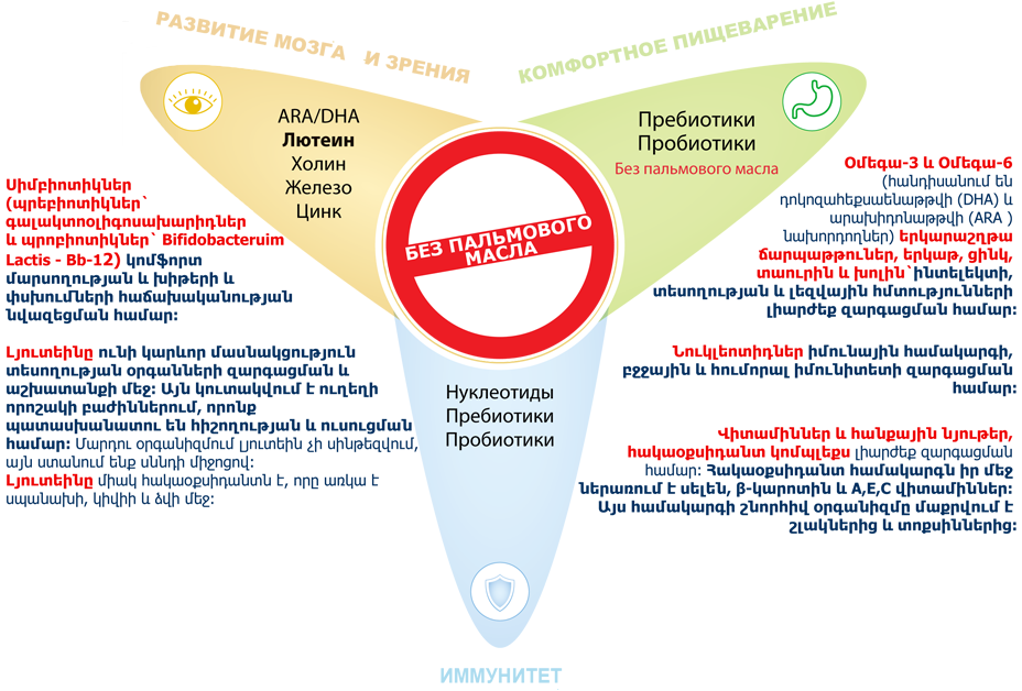 Ճարպազերծված կաթ, լակտոզա, ԲՈՒՍԱԿԱՆ ՅՈՒՂԵՐ (օլեինաթթվի բարձր պարունակությամբ արևածաղկի յուղ, կոկոսի յուղ, սոյայի յուղ), շիճուկային սպիտակուցի խտանյութ, գալակտոօլիգոսախարիդներ (ԳՕՍ), ՀԱՆՔԱՅԻՆ ՆՅՈՒԹԵՐ (կալիումի ցիտրատ, կալցիումի կարբոնատ, նատրիումի ցիտրատ, մագնեզիումի քլորիդ, նատրիումի քլորիդ, կալիումի հիդրոֆոսֆատ, երկաթի սուլֆատ, ցինկի սուլֆատ, պղնձի սուլֆատ, մանգանի սուլֆատ, կալիումի յոդիդ, նատրիումի սելենիտ), շիճուկային սպիտակուցի հիդրոլիզատ, ՎԻՏԱՄԻՆՆԵՐ (ասկորբինաթթու, խոլինի բիտարտատ, ասկորբիլ պալմիտատ, նիացինամիդ, կալցիումի d-պանտոտենատ, թիամինի հիդրոքլորիդ, վիտամին A, պիրիդօքսինի հիդրոքլորիդ, բետա կարոտին, ֆոլաթթու, վիտամին K1, ռիբոֆլավին, d-բիոտին, վիտամին D3, վիտամին B12), էմուլգատոր սոյայի լեցիտին, արախիդոնաթթու (АA) ստացված M.alpina յուղից, դոկոզահեքսաենաթթու (DHA) ` ստացված C. cohnii յուղից, ինոզիտոլ, տաուրին, տրիպտոֆան, բիֆիդոբակտերիա լակտիս (Bifidobacterium lactis), ՆՈՒԿԼԵՈՏԻԴՆԵՐ (ցիտիդին-5′-մոնոֆոսֆատ, դինատրիումի ուրիդին 5′-մոնոֆոսֆատ, ադենոզին 5′-մոնոֆոսֆատ, դինատրիումի գուանոզին 5′-մոնոֆոսֆատ), տոկոֆերոլների խառնուրդ պարունակող հակաօքսիդիչ, կարնիտին և ԿԱՐՈՏԻՆՈԻԴՆԵՐ (լյուտեին, բետա-կարոտին): Կարող է պարունակել խոլինի քլորիդ: